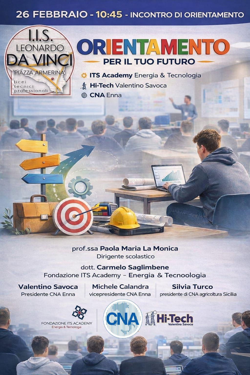 Si comunica che in data 26 FEBBRAIO, ALLE ORE 10:50, presso la Sede Centrale, si terrà un incontro di orientamento con “Fondazione ITS Academy – Energia & Tecnologia” e la CNA Enna. rivolto alle studentesse e agli studenti delle classi quinte di tutti gli indirizzi