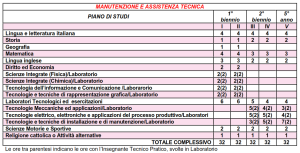 Oltre alle materie comuni a tutti gli indirizzi studierai: Tecnologie e tecniche di rappresentazione grafica, Chimica, Fisica, Tecnologie dell’Informazione e della Comunicazione, Laboratori Tecnologici ed esercitazioni, Tecnologie Meccaniche e applicazioni, Tecnologie ElettricoElettroniche e Applicazioni e Tecnologie e Tecniche di Installazione e di Manutenzione.