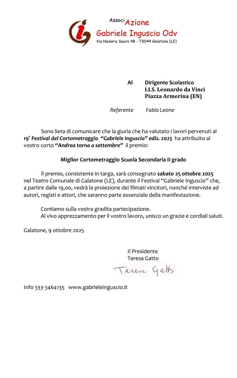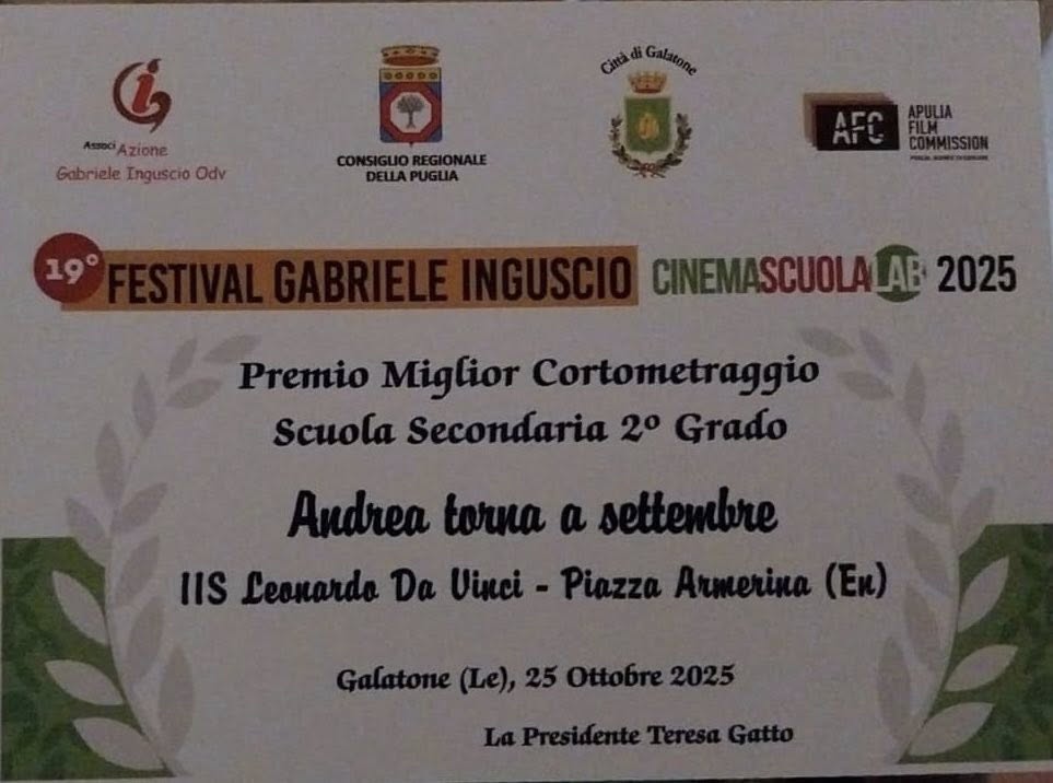 L’Istituto ha ottenuto il Premio Miglior Cortometraggio sezione “Scuola secondaria di secondo grado” al 19° Festival Gabriele Inguscio – Cinema Scuola Lab. 2025, svoltosi a Galatone (Le), con il corto “Andrea torna a settembre” tratto dal romanzo di Alessandro Gallo. Il progetto realizzato con i fondi PNRR del DM 170/2023 ha visto impegnati gli studenti guidati dall’associazione Caracò e dai tutor/docenti interni della scuola. Il riconoscimento è stato consegnato durante la serata finale del festival, che ogni anno valorizza la creatività e il talento dei giovani attraverso il linguaggio cinematografico. Il lavoro dei ragazzi del “Da Vinci” è stato apprezzato per la sensibilità del racconto, la qualità della realizzazione e il messaggio di amicizia e riflessione che trasmette.